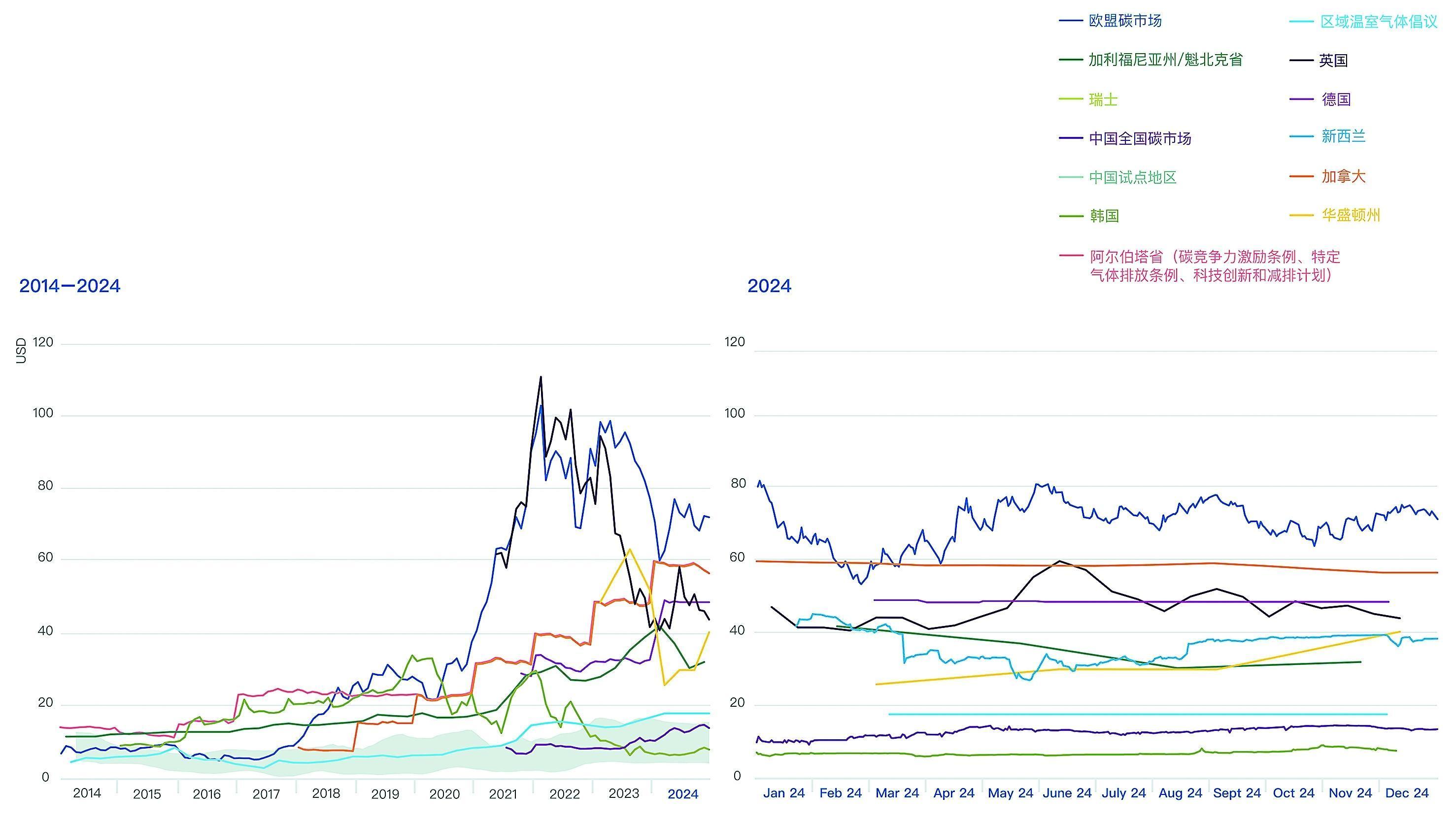 该图第一页的价格走势使用了ICAP配额价格浏览器以及本报告司法管辖区介绍的数据,直观地显示2014年以来的长期历史趋势(左图)和2024年配额市场的发展趋势(右图)。短期和长期价格变化是由于当前和未来预期的配额稀缺性的变化所致,导致这些变化的因素有总体经济状况的变化、碳市场规则的修订(包括抵销机制和市场稳定机制的规则)以及与其他气候和能源政策的相互作用。阴影区域表示中国八个区域碳市场的价格区间。第二页的图显示的是政府在一段时间内拍卖配额所获得的收入信息。收入的多少取决于司法管辖区的排放规模、碳市场的覆盖范围、拍卖配额的占比和配额价格。在所有的图表中,非美元货币的数值均使用国际货币基金组织的月度汇率数据转换为美元。当本地碳价不变时,曲线的变化是由汇率变动造成的。