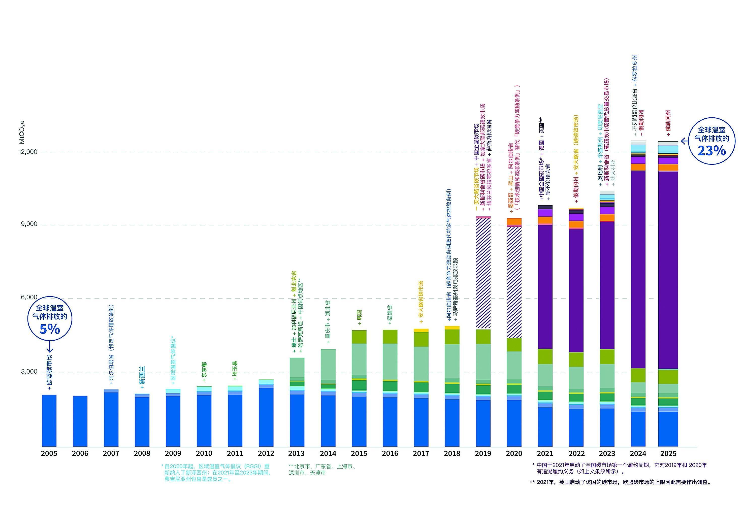 该图描绘了全球碳市场的增长情况。碳市场所覆盖的全球温室气体排放比例已超过23%,是2005年欧盟碳市场启动时的四倍之多。这一变化趋势受到多个因素的交互影响,包括新行业和体系的加入、一些体系配额总量的逐步收紧,以及全球排放量的持续增长。