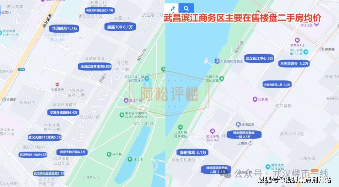 二七滨江主力楼盘二手房均价基本都过了4万元/平,甚至武汉天地云廷三期破了8万元/平,武昌滨江二手房即使核心地段,大部分也才约2-3.5万元/平,只有武汉长江中心二手房均价到了5万元/平。