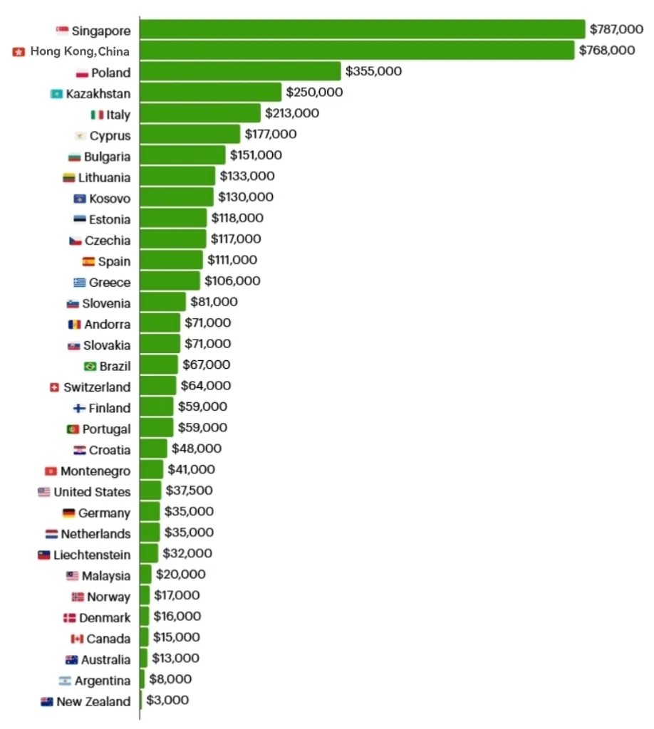 在更大范围内,欧洲与亚洲多国或地区形成了高奖金的密集区。除新加坡和中国香港外,波兰、哈萨克斯坦、意大利等11个国家/地区,个人项目金牌奖金均超10万美元。