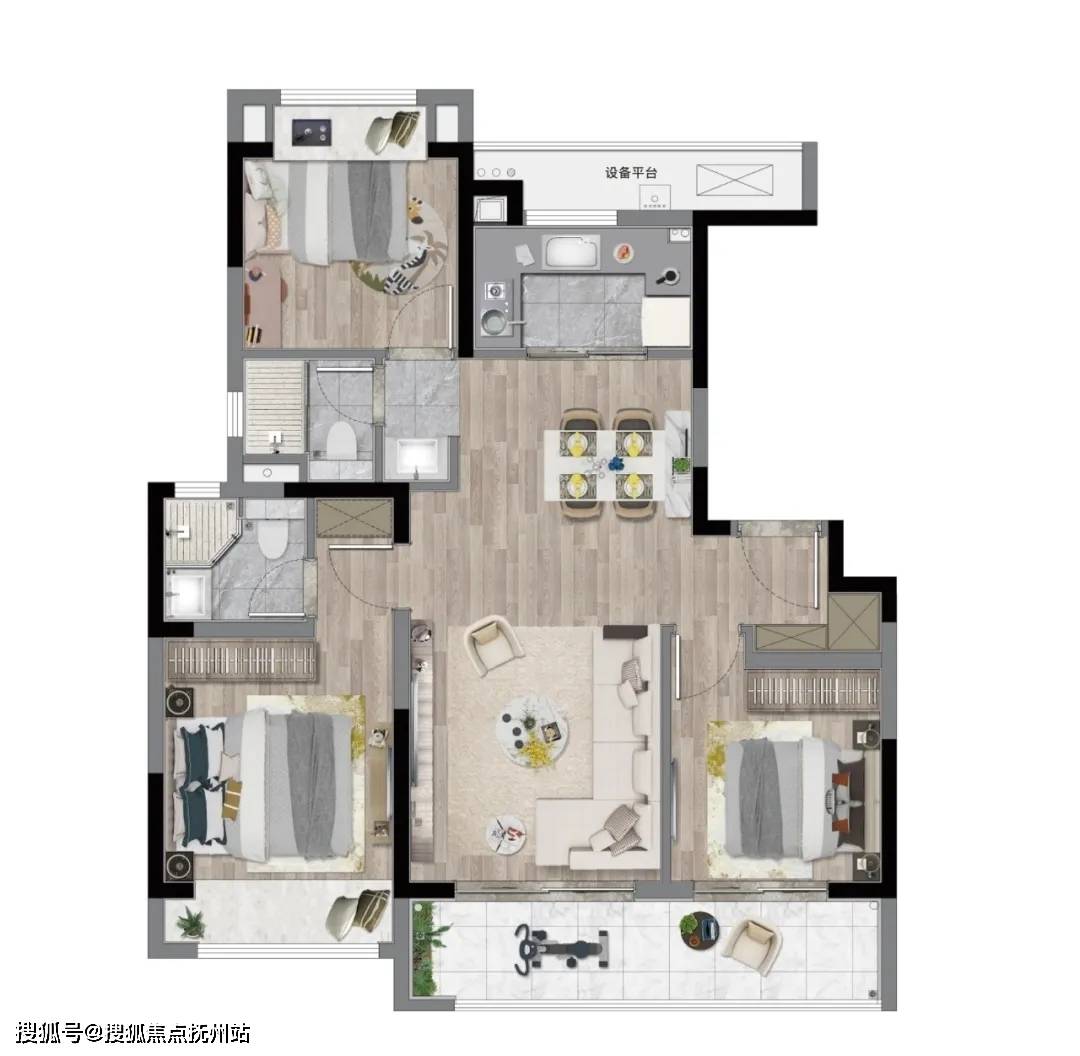 建面约118㎡三房两厅两卫的户型,将原本应该是140㎡豪宅元素全部放入其中,简直是一次空间格局降维打击。